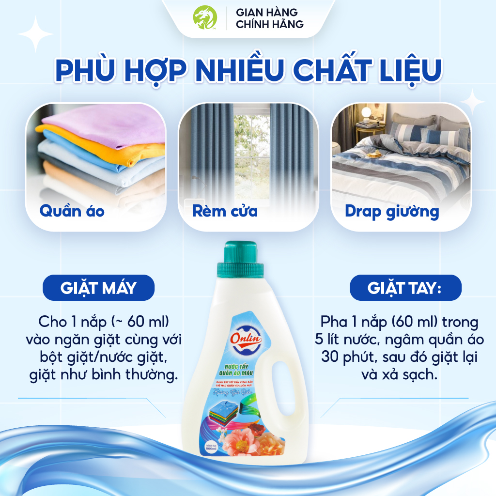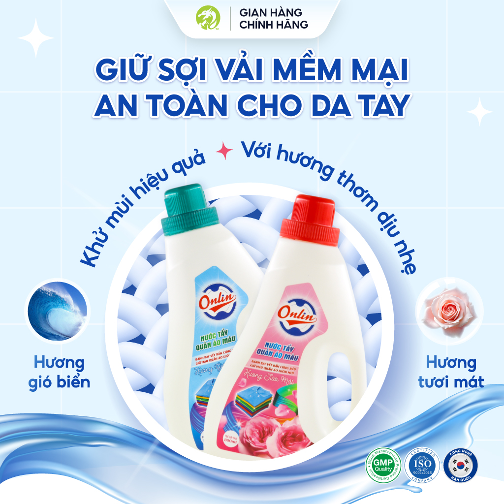 Nhờ công nghệ làm sạch dịu nhẹ và hương thơm tươi mát, nước tẩy vải màu Onlin là lựa chọn hoàn hảo cho mọi gia đình muốn giữ quần áo như mới – sạch thơm bền lâu – bảo vệ từng sợi vải.